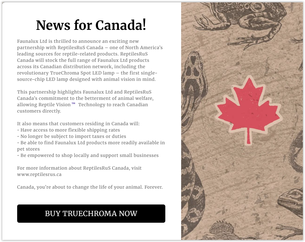This partnership marks a major milestone for reptile keepers across the country. By bringing the full range of Faunalux products, including the revolutionary TrueChroma Spot LED, into our Canadian distribution network, we’re ensuring that reptile enthusiasts and retailers alike have direct access to technology designed specifically with animal vision and wellbeing in mind.